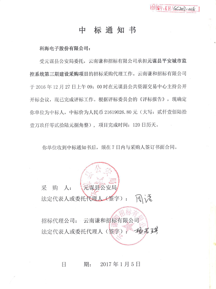 正值寒冬季節(jié),美麗的昆明依然陽光普照、溫暖如春,我公司也如同這燦爛的天氣一般,在年末收官之際頻獲喜訊??坪k娮庸煞萦邢薰驹俅螒{借著雄厚的技術(shù)力量和良好的信譽于2016年12月28日順利中標(biāo)“元謀縣平安城市控系統(tǒng)第三期建設(shè)采購項目”,中標(biāo)金額:21619026.80元。